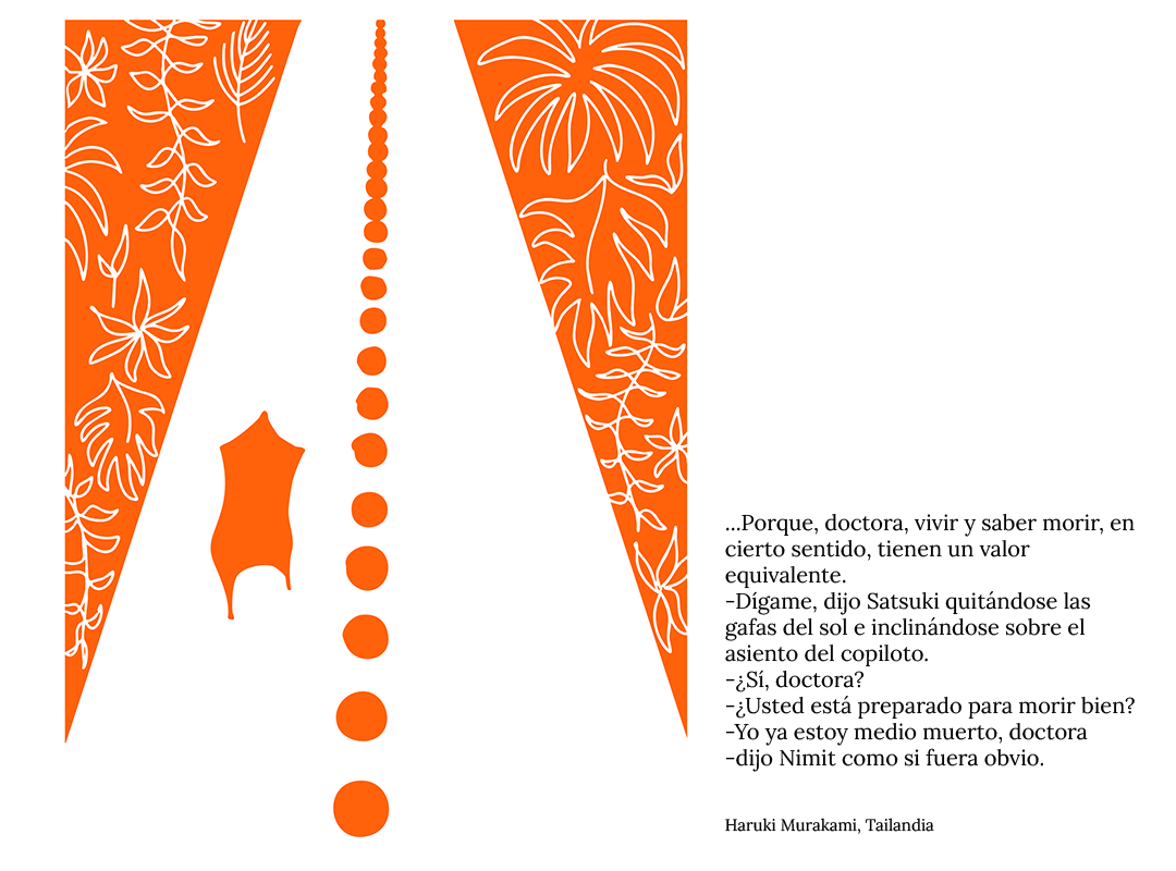 Esta ilustración impresa en serigrafía fue mi interpretación de una frase del cuento “Tailandia” de Haruki Murakami. El relato explora temas como el resentimiento, el odio, la liberación, la búsqueda de la paz interior y una reflexión sobre el significado de la muerte. En cuanto leí cierta frase del cuento supe que quería que me ilustración representar a este concepto la fina línea entre la vida y la muerte.